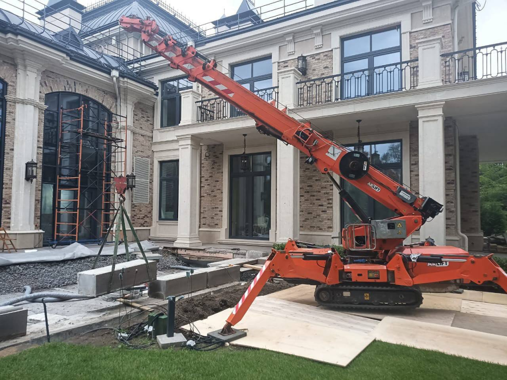 Мини-краны пауки отлично подходят для объектов с жесткими ограничениями доступа и пространства для работы. Они эффективны для фасадного и высотного монтажа, перемещения грузов внутри здания и установки конструкций на горизонтальном вылете стрелы — когда нужно, например, пробраться под козырёк. За счёт компактных габаритов эта компактная техника может работать на перекрытиях — там, где обычные машины не пройдут по весу. Рассмотрим реальные примеры задач, с которыми работают мини-краны пауки: