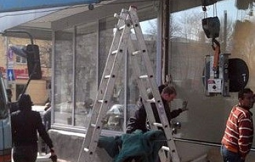 Мини-кран JEKKO, оборудованный интегрированным на стрелу вакуумным захватом, осуществил замену стекла. Уникальность монтажной работы состояла в том, что стекло было расположен под обратным углом относительно земли.