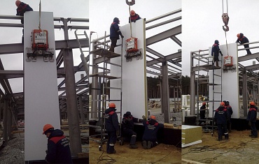 Монтаж стеновых сэндвич-панелей с помощью вакуумных захватов