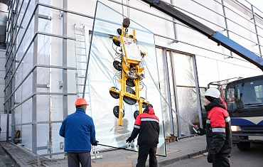 Арлифт произвела установку витрины магазинов с помощью подъёмника WIENOLD, мини-крана Jekko SPD360CDH и вакуумного захвата ARLIFTER GS-850