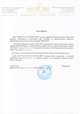 Благодарность от ТОО "NURLYTAU CONSTRUCTION"