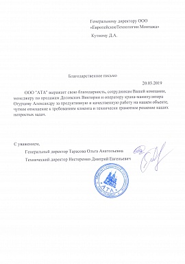 Благодарственное письмо от ООО "АТА"