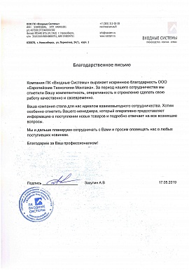 Благодарственное письмо от ООО ПК "Входные системы"