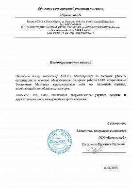 Благодарственное письмо от ООО "Евросклад-2"