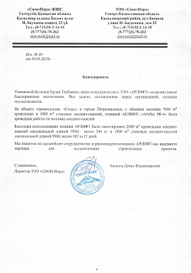 Благодарность от ТОО "Сион-Норд"