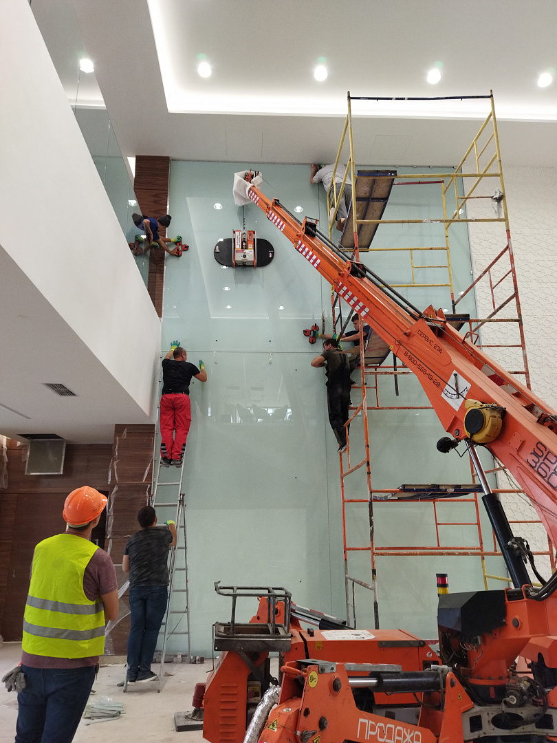 Декоративные стекла весом около 400 кг смонтировали для только что построенного здания посольства Объединенных Арабских Эмиратов в Казахстане. Монтаж проходил внутри помещения, а такая работа всегда требует максимальной внимательности и аккуратности.