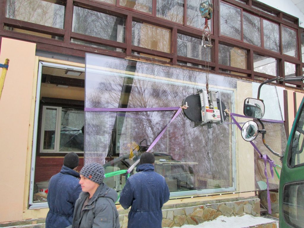 РЗК Курочкино, остекление веранды. Монтаж стекла 4,8 х 2,5 метров (510 кг). Монтировали с помощью вакуумной присоски ARLIFTER GS-850.